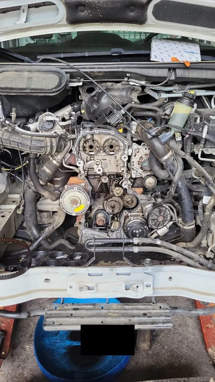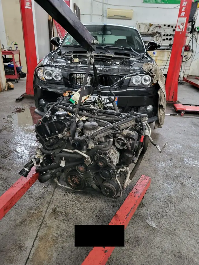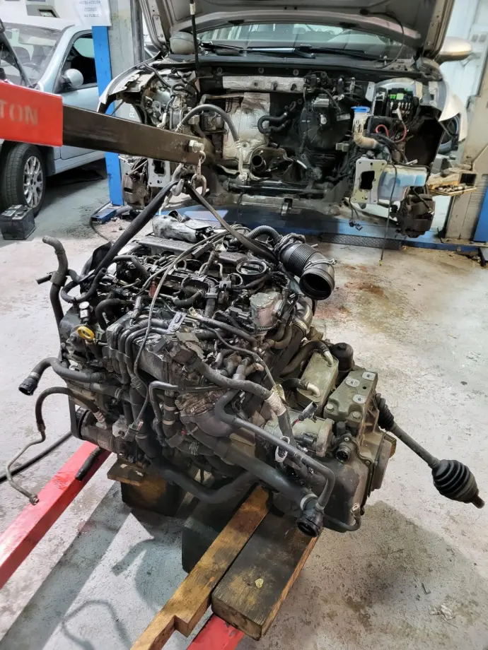 Dépose complète de l’ancien moteur et montage d’un moteur d’occasion révisé.